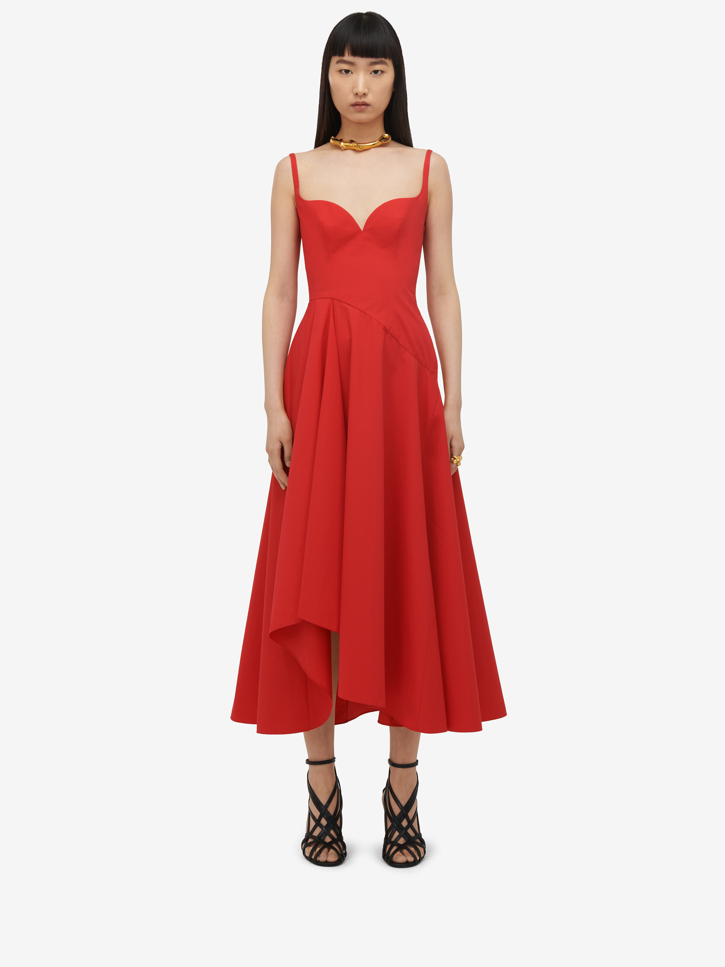 Abito midi in popeline di cotone compatto rosso acceso con scollo a cuore, vita asimmetrica e gonna arricciata. Chiusura con zip sul retro.